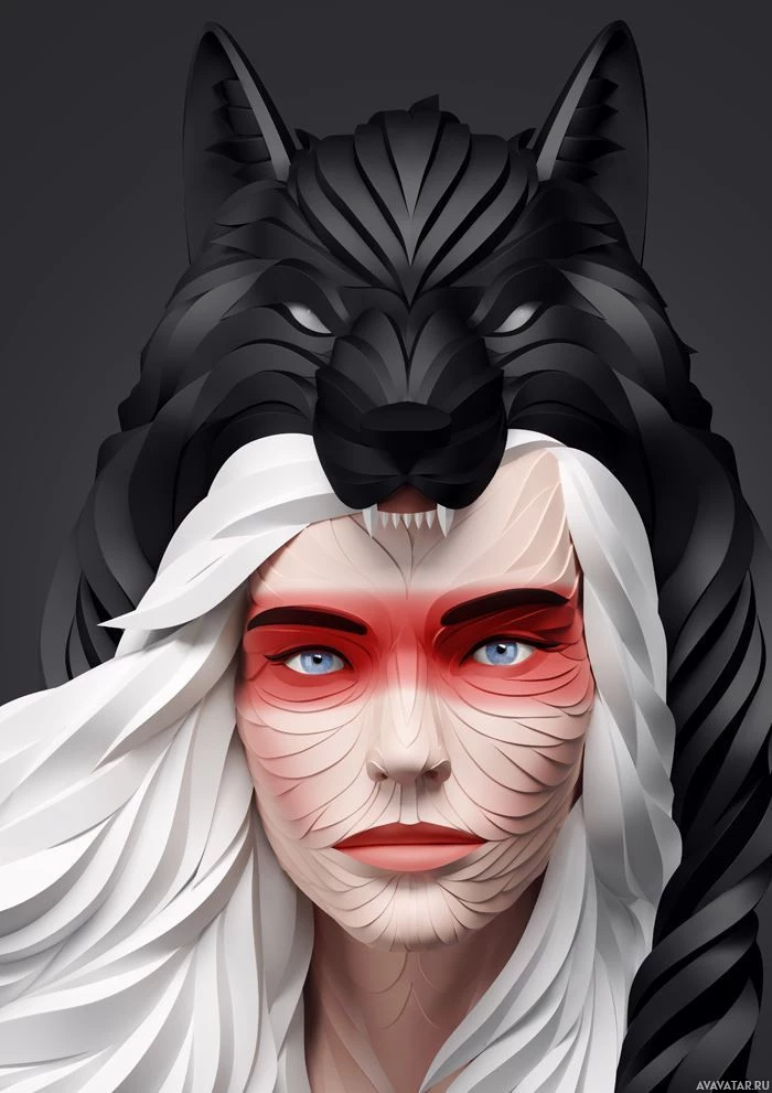 The image depicts a person with features that appear to blend human and animal traits. On the left side, there's a wolf's head with