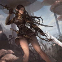 the midst of combat or preparation for battle, as they are holding one sword raised in front of them while their other hand grasps another sword. The background suggests a forest setting, possibly a location within
