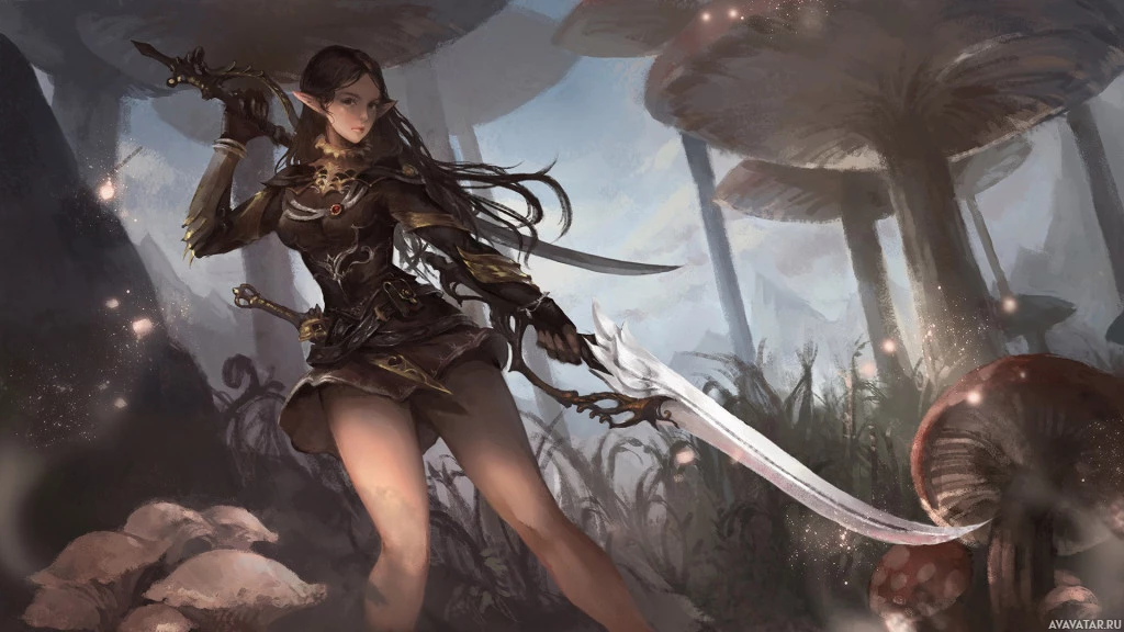 a fantasy scene featuring an elf-like character. This character is armed with two swords and appears to be in