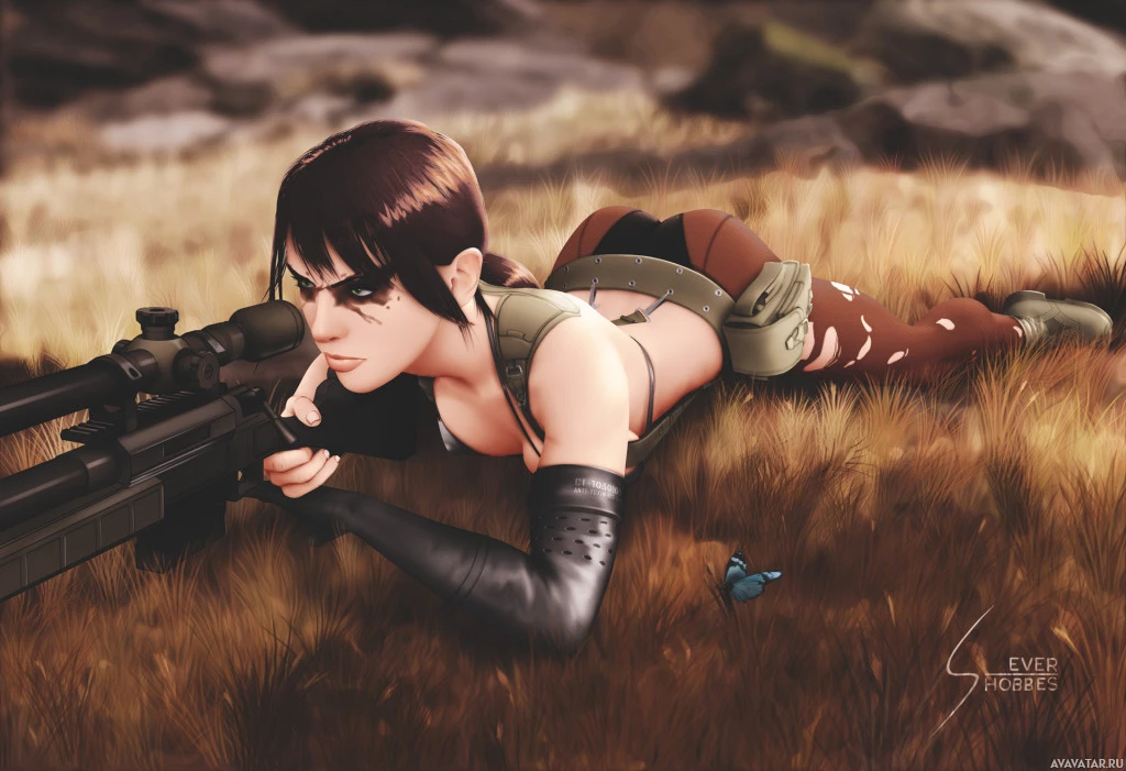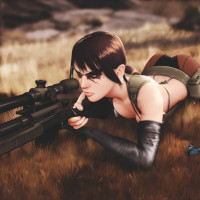 combat situations. The character is holding a rifle with a scope, indicating that she is prepared for combat or target shooting. This image could be related to