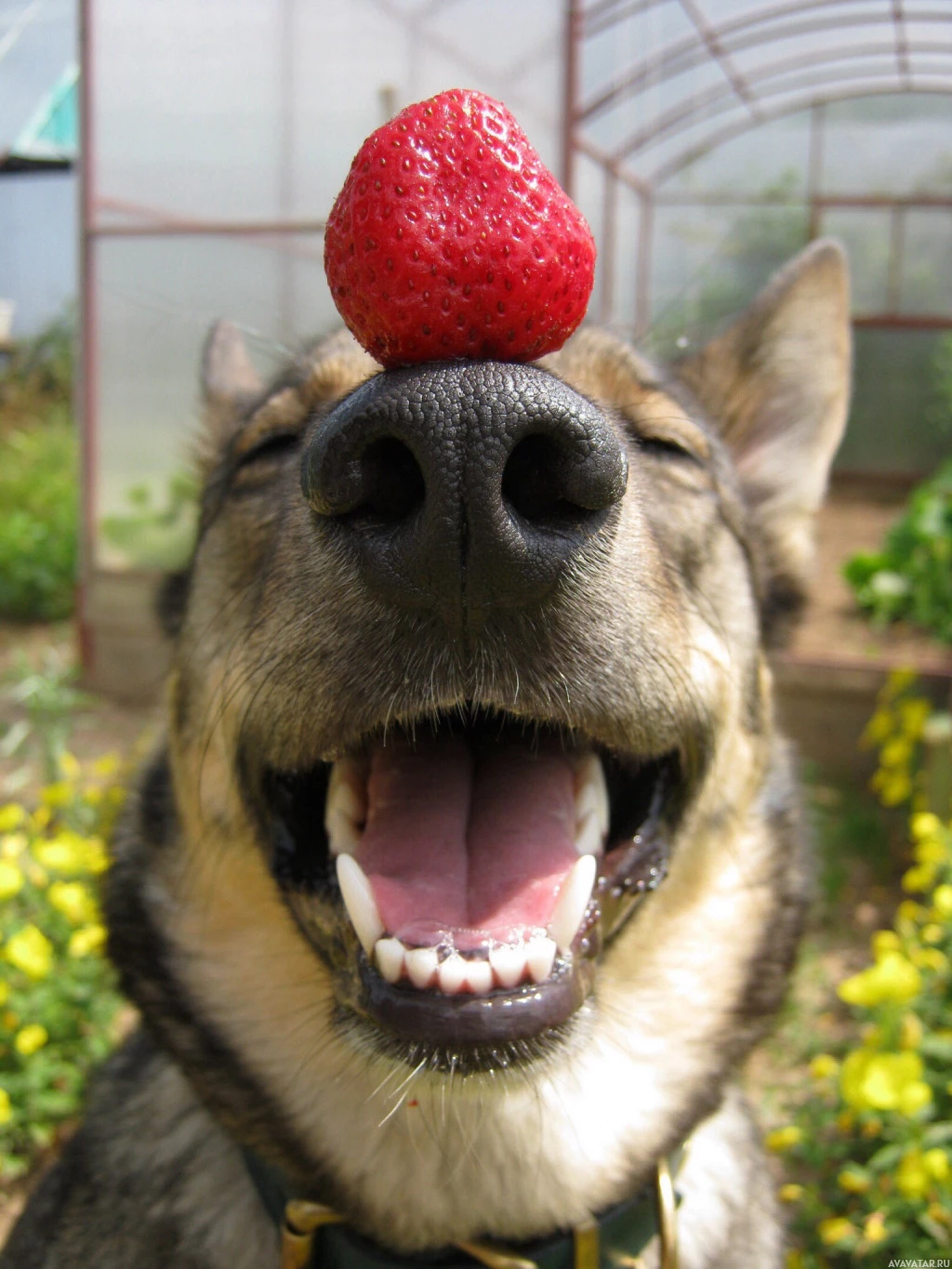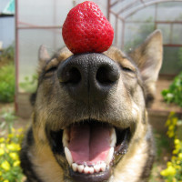 На снимке изображена собака с носом вверх по воздуху, словно нюхающая. Красная ягода помещается на голову собаки. Фон предполагает наружную обстановку с зеленью, которая может быть садом или парковой зоной.