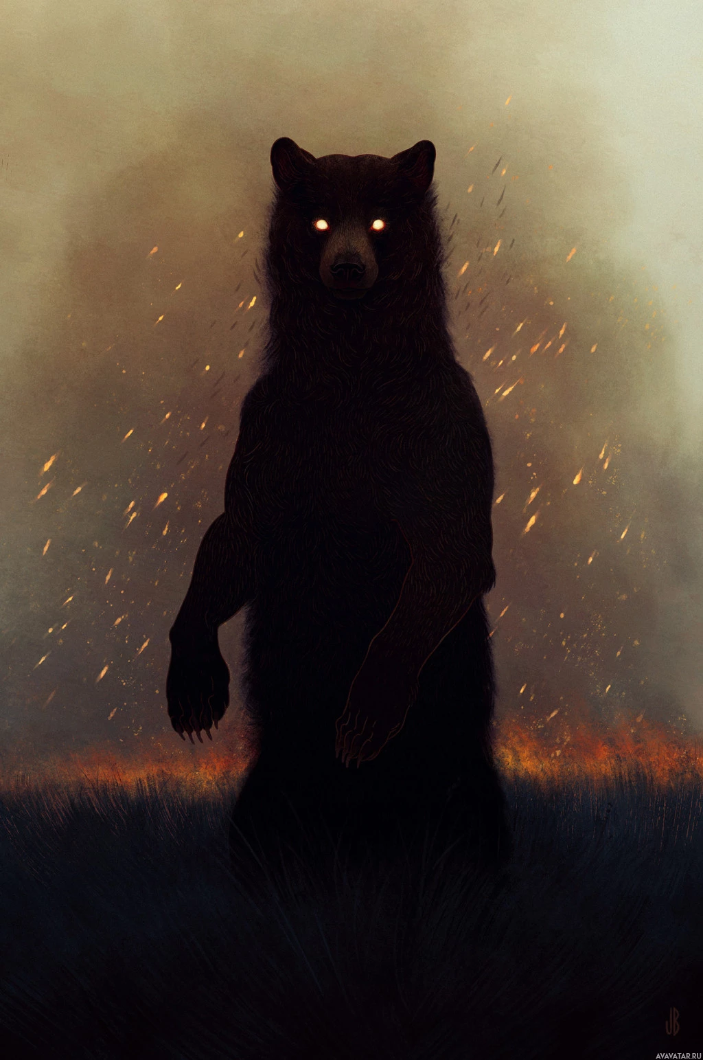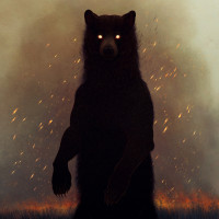 a brown bear or grizzly bear, standing in an ominous setting. The bear is facing the viewer with its mouth open as if it's roaring or growling. In the background, there are flames or fire visible, suggesting that this could be an image from