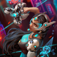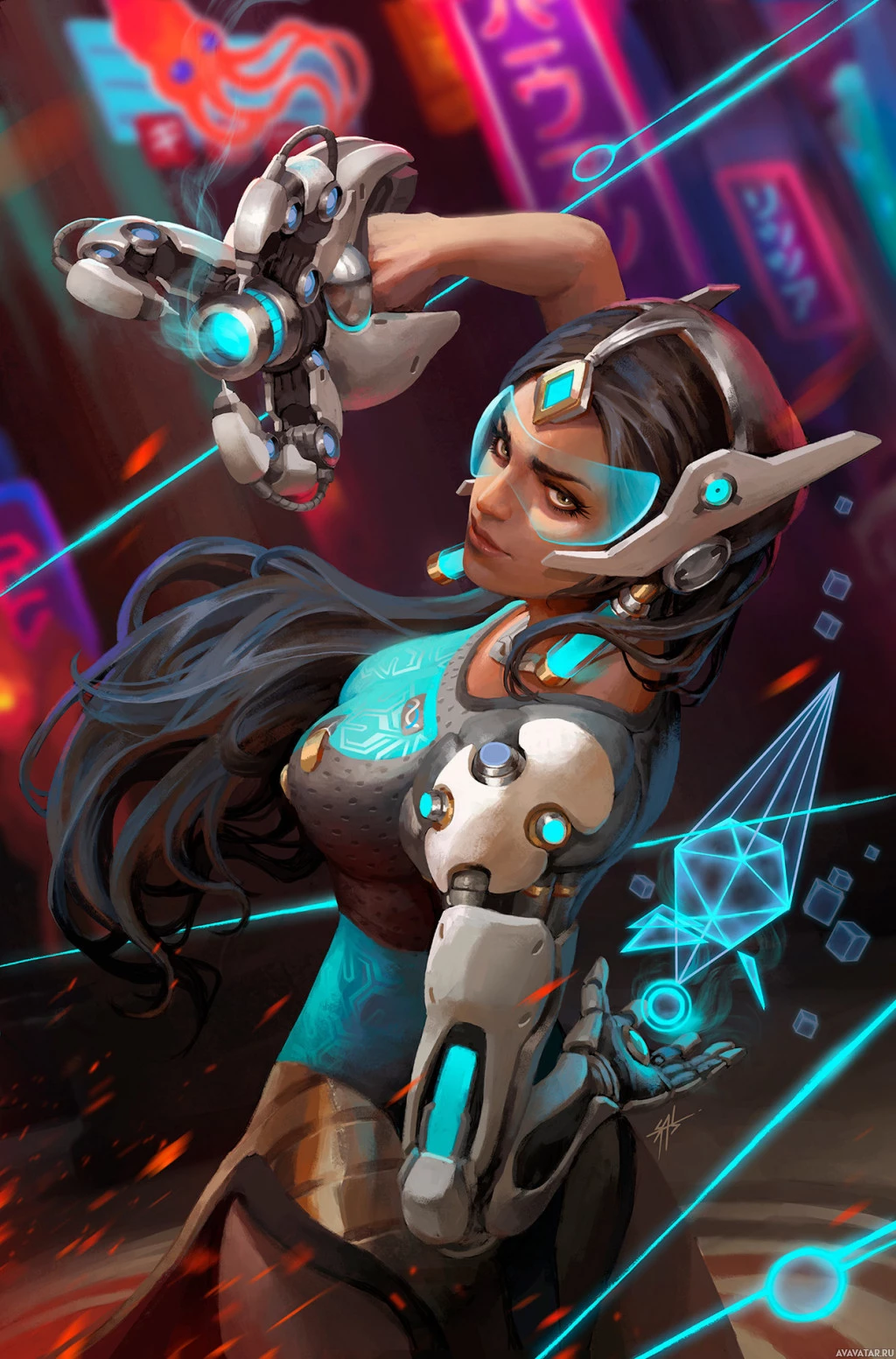 a female character from the video game "Overwatch." This character is known as Symmetra and is recognized by her robotic appearance and her abilities that revolve around teleportation and construct creation. She is shown in