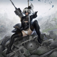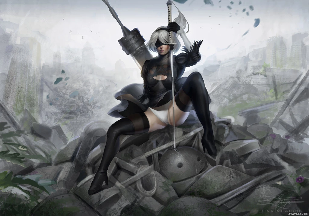 the video game "Nier: Automata." The character is sitting on rubble with