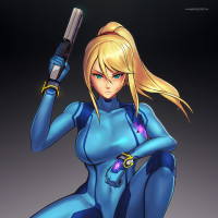The image shows a female character in armor, known as Samus Aran from the "Metroid" video game series. She is holding a gun and appears to be in a combat stance, ready for action. This character is often associated with exploration and shooting elements within her games.
