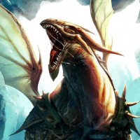 a fantasy scene featuring a dragon as the central figure. The dragon is illustrated in