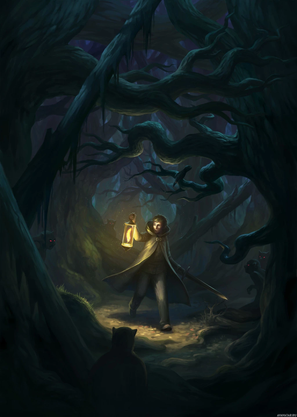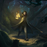 a forest at night, holding a lantern. The individual appears to be wearing a cloak or jacket and is possibly on an adventure or search through