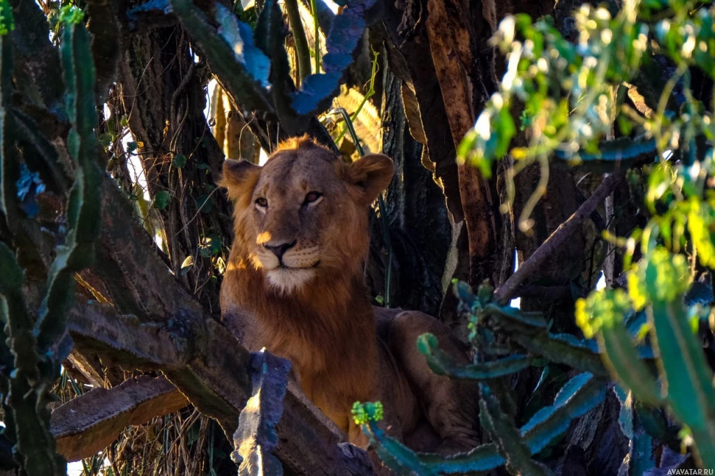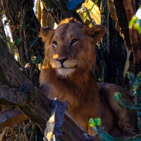 dense vegetation, possibly in a wildlife reserve or a zoo. The lion's mane is visible and it appears to be looking intently towards something off-camera. The environment around the lion includes various plants and trees with distinctive textures, suggesting