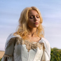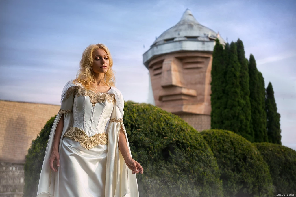 a bridal dress with long sleeves and an ornate design, which suggests she may be in a formal or special occasion setting. Behind her is a structure that resembles