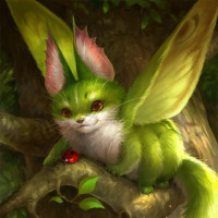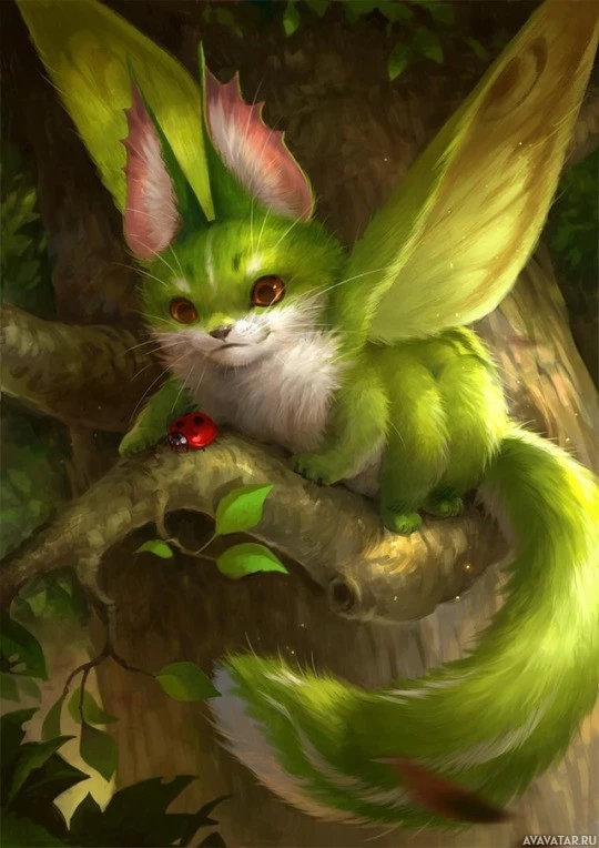 pointed ears and bright eyes, giving it an alert and curious appearance. The creature's fur is mostly green, with some lighter areas and what appears to be pink or purple markings on its face and back. There's also a small