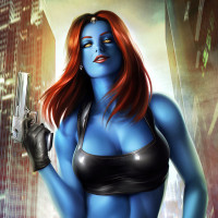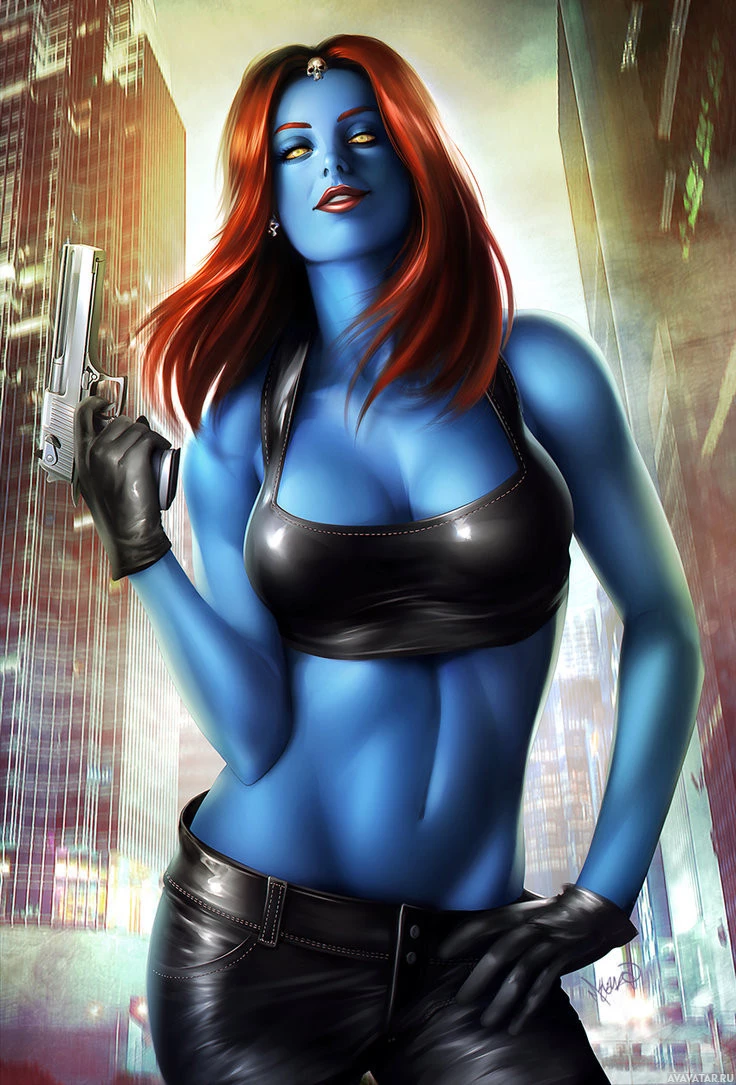 The image features a character known as Mystique from the X-Men series. She is depicted in her iconic blue, scaly skin and is holding a gun, embodying the role of an anti-heroine within the comic book universe.