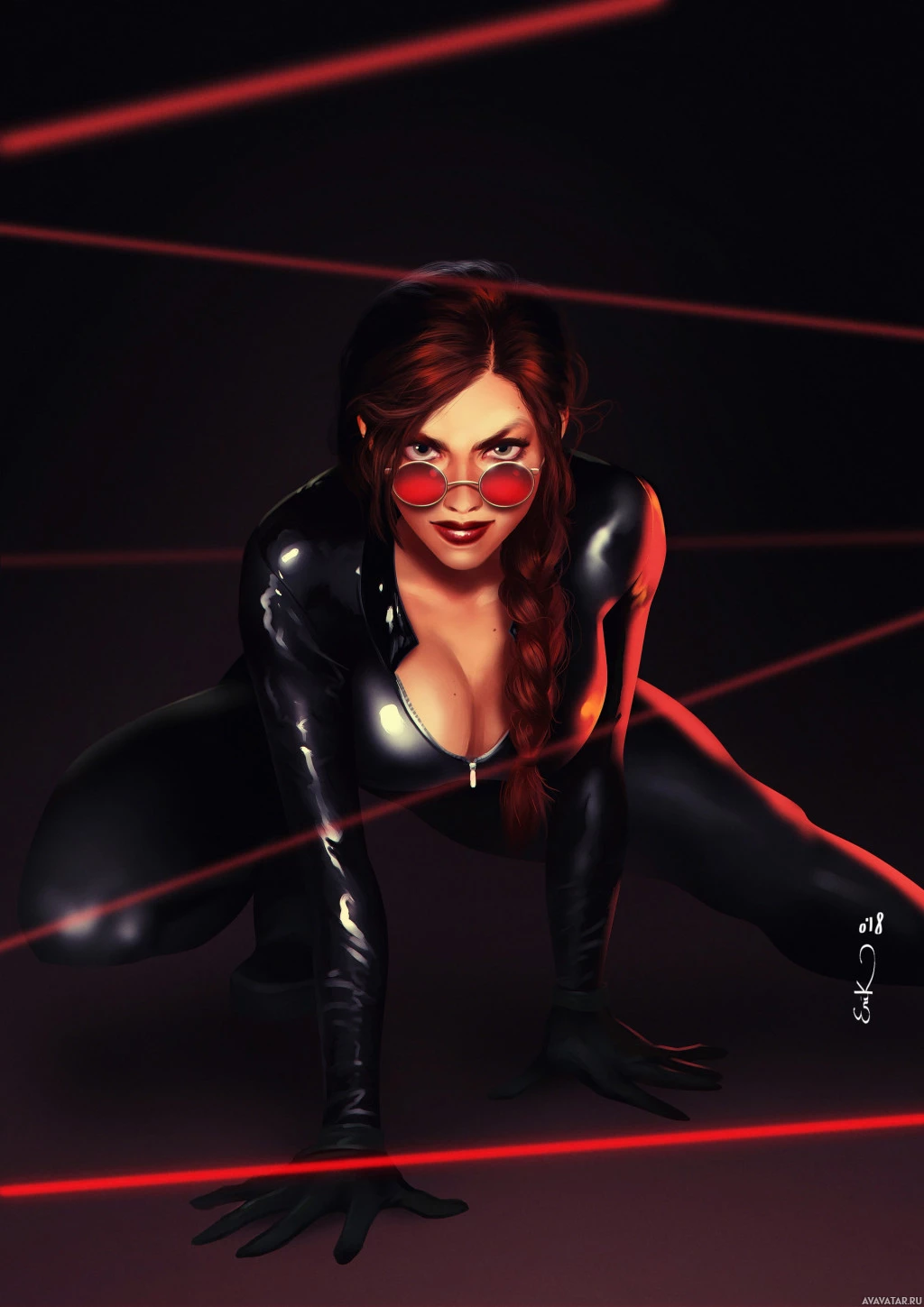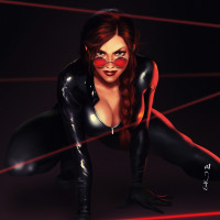 red hair and is depicted in a crouched pose with her hands outstretched, as if she's ready to pounce or move quickly. There are red laser beams coming from behind her, suggesting that she might be engaging in some sort of high-tech or action scenario. The character is designed with a strong and confident stance, which could imply she is a superhero or