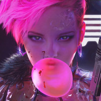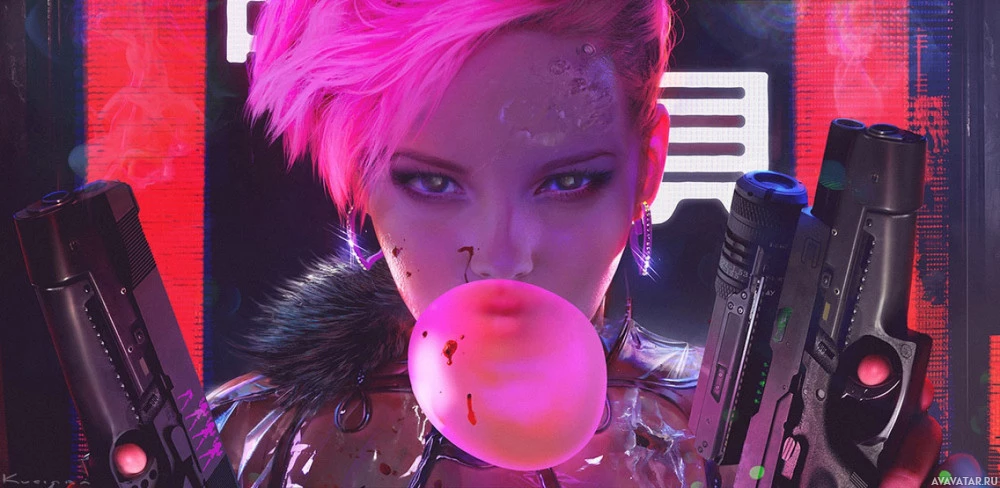 pink hair, dressed in what appears to be futuristic or cyberpunk-inspired attire. The individual is holding a gun with both hands and has