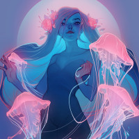 different sizes and colors, some with trailing tentacles. These jellyfish are also in shades of pink, blue, and white, which adds to the ethereal and fantastical theme of the artwork. The background is a dark, deep blue that complements the sea creature's appearance. The image has an almost surreal quality to it, blending elements of nature with the figure in a way that suggests a mythological or whimsical concept rather than a real-