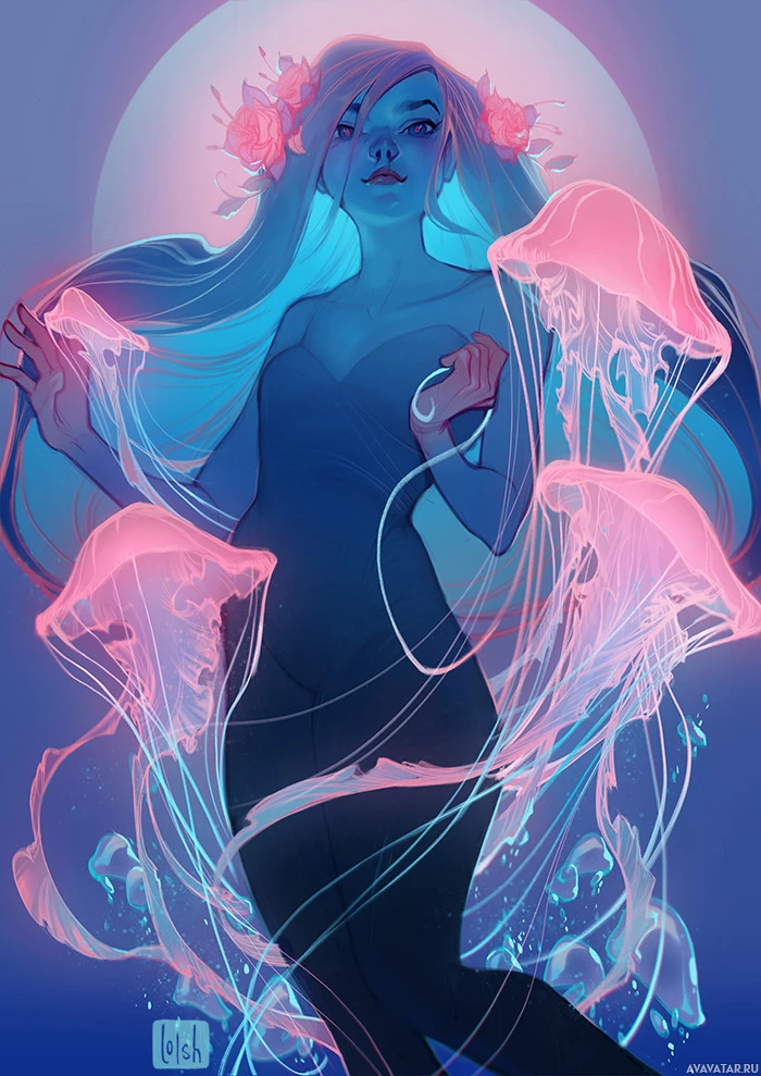 flowing hair and a pinkish hue, resembling jellyfish. She has large,