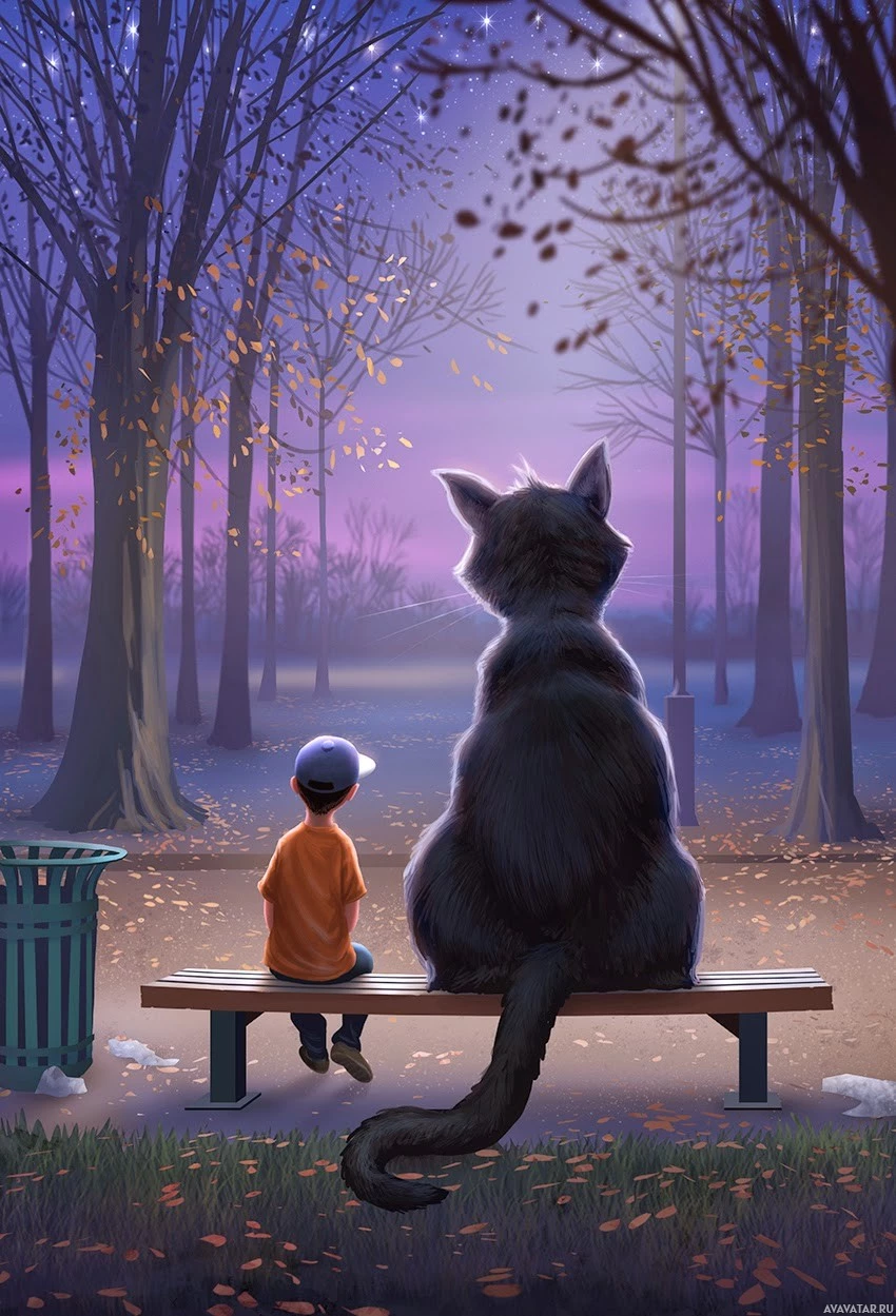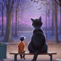 night scene with a young boy sitting on a park bench. Accompanying the boy is a large