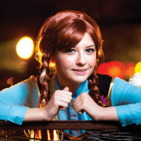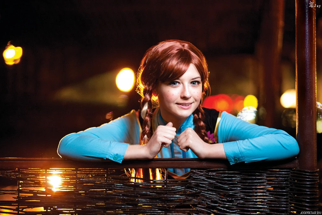 In the image, there is a person dressed as Anna from the movie "Frozen." The individual is wearing costume elements that resemble those of Anna's appearance in the film, such as her hair braided into snowflake patterns and her