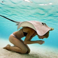 green hue, indicating that it's shallow and sunlit. This scenario suggests a scuba diving or snorkeling experience in which the person may be interacting with