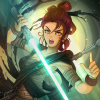 red hair and holding a lightsaber. She is wearing a brown