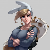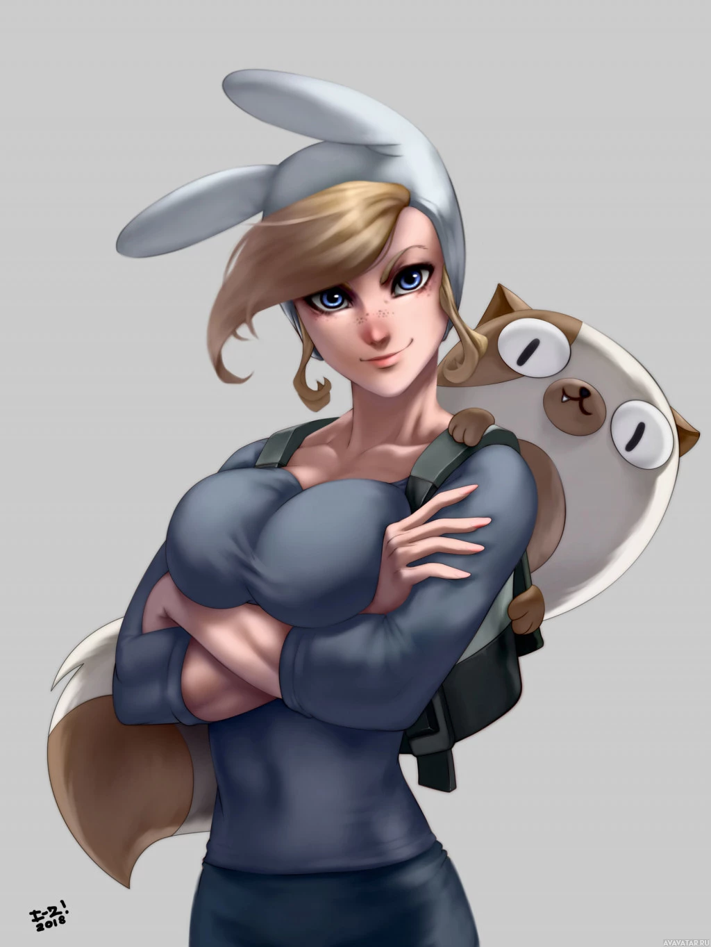 На картинке изображен анимированный персонаж из серии «Время приключений». Она женщина со светлыми волосами, в фиолетовой рубашке и кроличих ушах в шляпе. Ее руки скрещены, что указывает на уверенную или напористую позицию. За ее плечом находится плюшевая игрушка, напоминающая существо, представляющее собой комбинацию кошки и собаки. Выражение и поза персонажа дают ощущение готовности к приключениям.