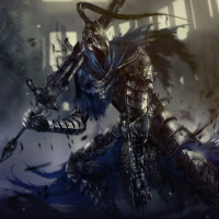 an armored figure with what appears to be a large sword or staff, standing in front of an ominous presence, possibly a creature like a werewolf, as suggested by the visible fangs and fur. The setting has a dark, foreboding atmosphere with mist and scattered debris, which is consistent with the game's