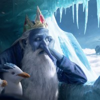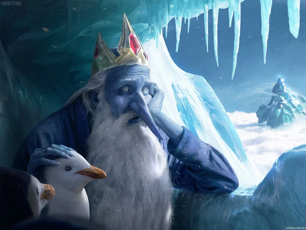 a large nose that resembles a carrot. Surrounded by ice formations and accompanied by two penguins, one of which appears to be interacting with him, the Ice King looks somewhat disheveled or concerned, which adds to the comedic