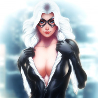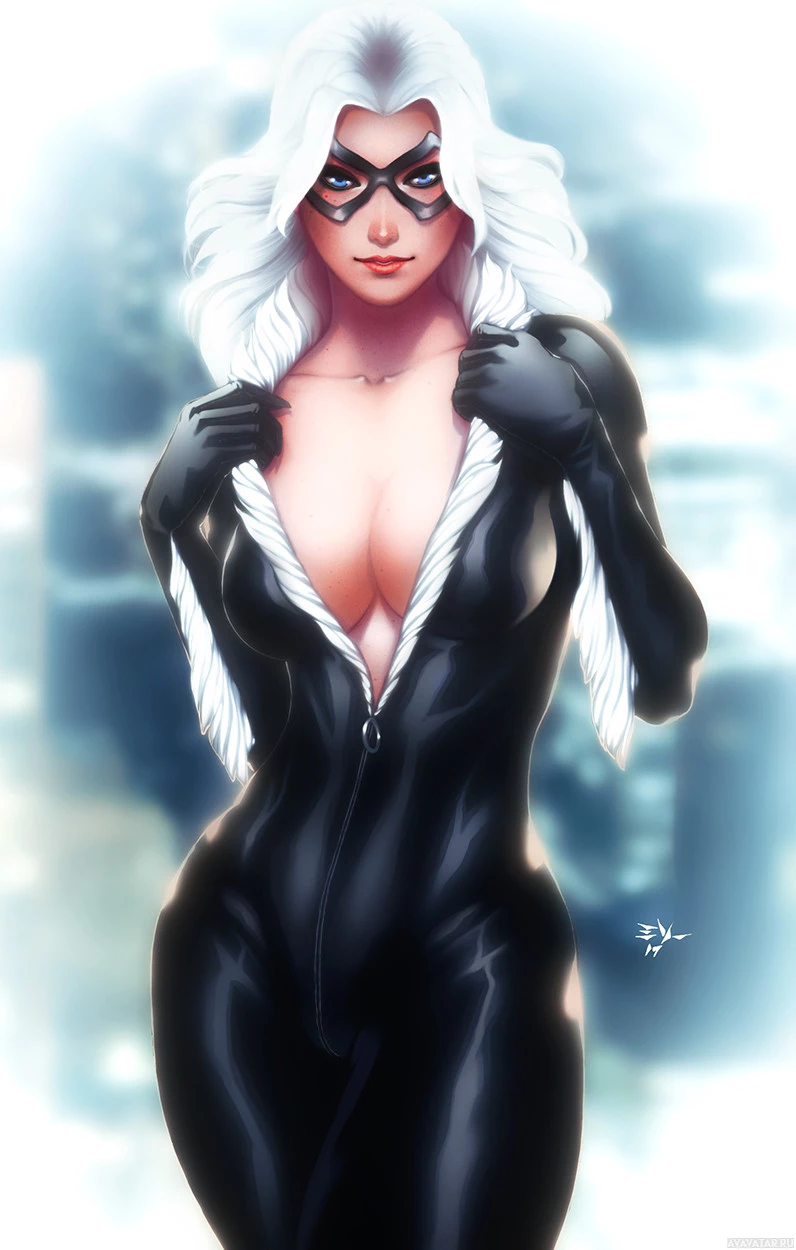 The image features a depiction of Black Cat, a fictional character from comic books published by Marvel Comics. She is portrayed as a skilled thief and an antagonist to Spider-Man in various media adaptations, including animated series and live-action films.