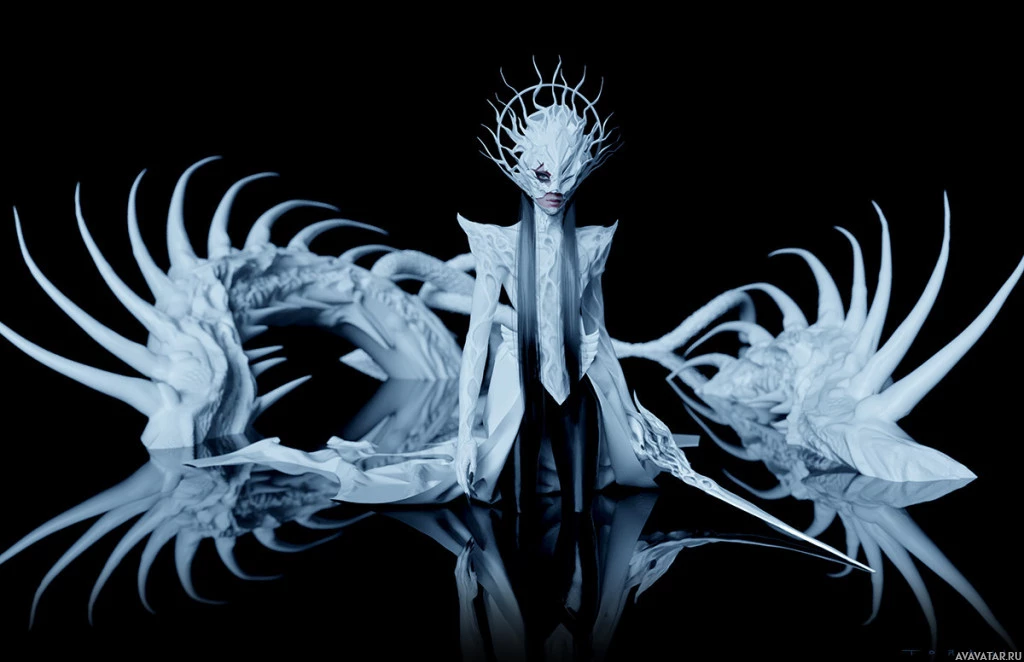 the body of a person but with long, intricate antler-like structures extending from its head, which resembles those of an elk or deer. Additionally, there are delicate, web-like veins or tendrils on its arms and shoulders that give it a mystical or otherworldly appearance. The background is dark with a reflective surface, possibly water, providing