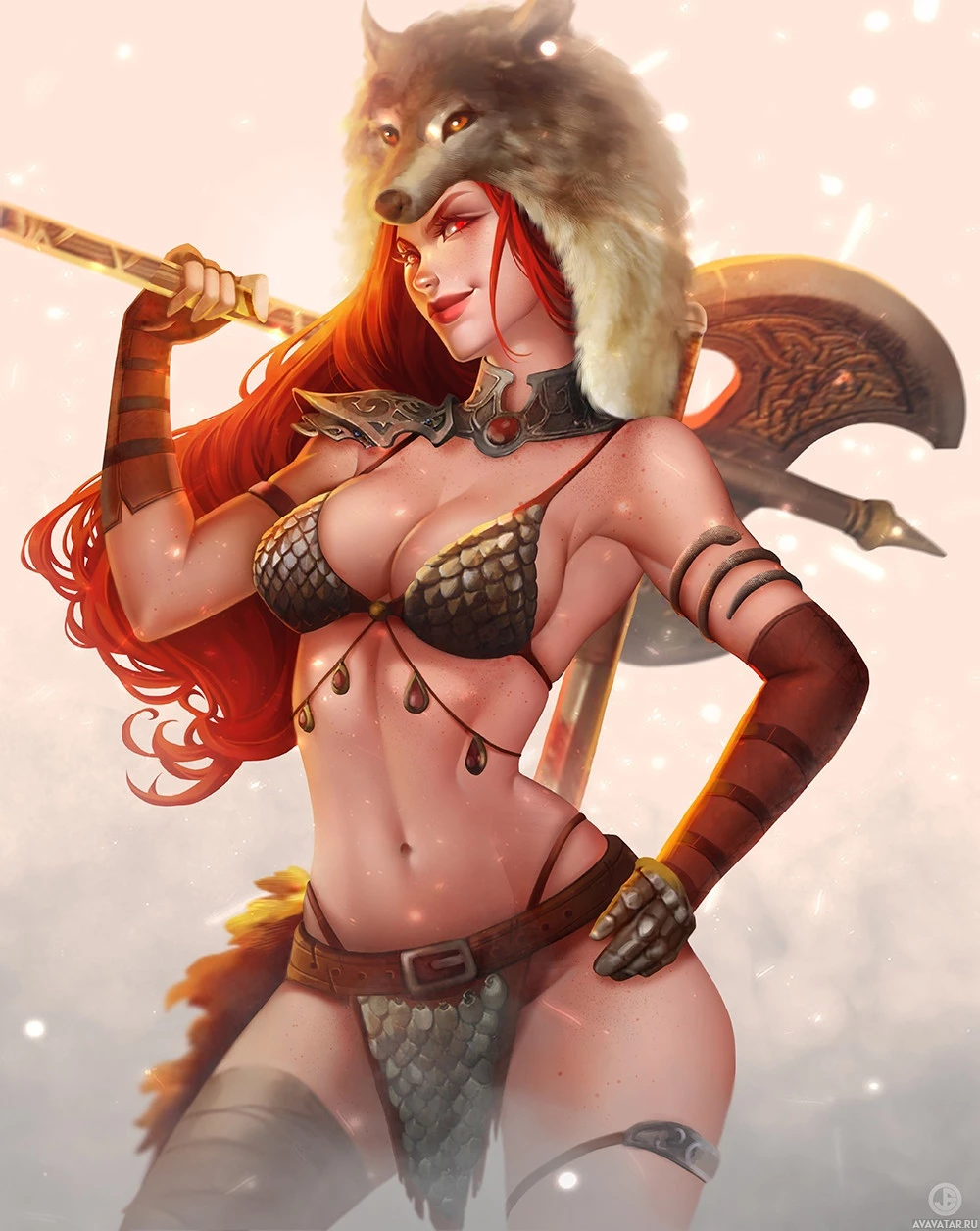 red hair and is wearing armor that includes a breastplate with intricate designs, a corset-style top, a skirt, and bracers on her arms. Additionally, she has a fur hat on her head and carries an axe in her left hand, suggesting a battle or