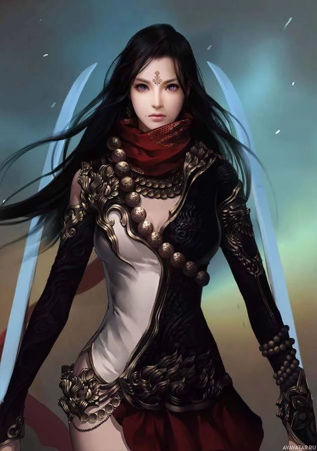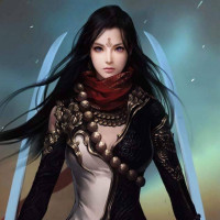 night sky, which adds to the dramatic and mystical atmosphere of the image. There's no visible sword in this picture, but her expression could suggest she is ready for battle or some form of combat.