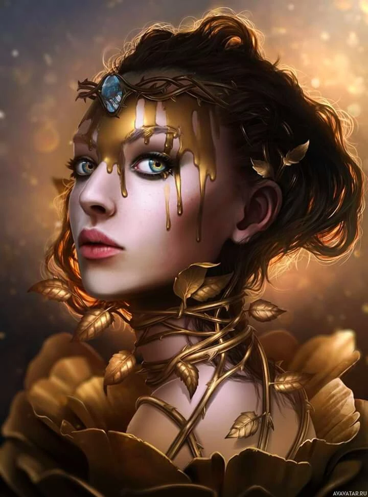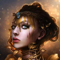 portrait of a woman with a fantastical and artistic design. She has an ethereal appearance, with golden elements such as leaves or perhaps flowers adorning her hair and necklace. There are also sparkles around her face and shoulders, suggesting a magical or otherworldly quality to the character. The background is softly blurred, enhancing