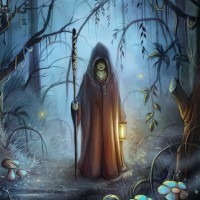 a hooded cloak that resembles a wizard or mystic's attire. This figure holds a staff and seems to be guiding with a lantern, suggesting they might be a guide in this