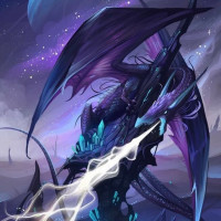 The image depicts a fantasy-themed illustration of a character that resembles a dragon. This creature has features typically associated with dragons, such as wings and a tail, but it also includes elements that are not commonly seen in dragons, like a human-like posture and the use of what appears to be technology or magic. The artwork is richly detailed, suggesting a storyline or mythology behind the character's design. The color palette is dark with purples and blues dominating the scene, which adds to its mystical and otherworldly atmosphere.