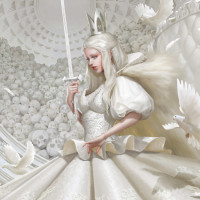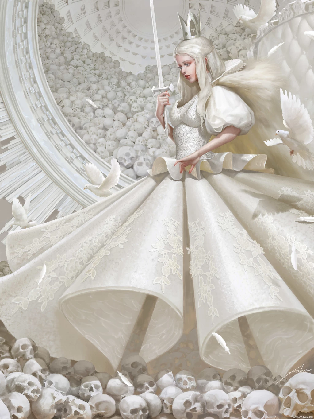 white dress with intricate lace details and accessories, including a crown on her head and holding what looks like a sword in one hand. Her hair is long and platinum blonde, enhancing the ethereal and majestic appearance of the character. She stands amidst an array of skulls which are scattered at her feet, suggesting a macabre or