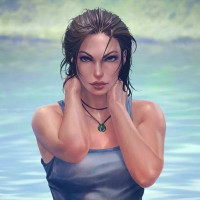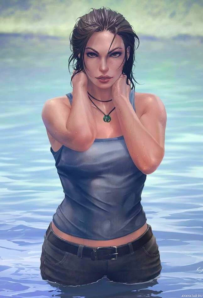 a female character who appears to be Lara Croft, a well-known video game character from the "Tomb Raider" series. She is depicted in her iconic attire, which includes