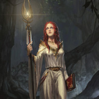 red hair. She is holding what looks like a staff or wand in one hand and a book in the other, suggesting she might be a wizard, sorcerer, or a figure of