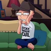 an animated movie, Steve Smith, who is depicted with his hand on his head and a surprised or distressed expression. He's wearing glasses, a hat, and a T-shirt that says "STAY INSIDE CARL." This scene captures