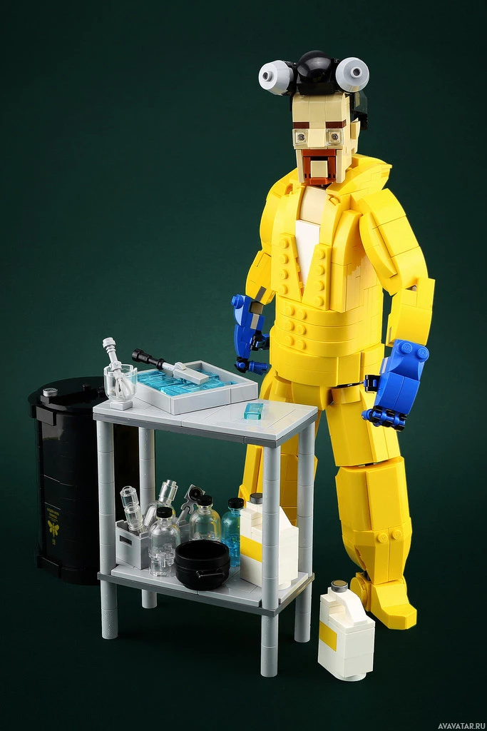 a Lego figure dressed as an astronaut or scientist, standing at what appears to be a makeshift chemistry station. The figure is wearing a bright yellow lab coat over