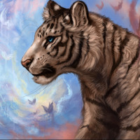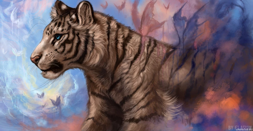 a majestic tiger standing in an artistic setting. It appears to be painted in a style that emphasizes the tiger's powerful and graceful nature, with