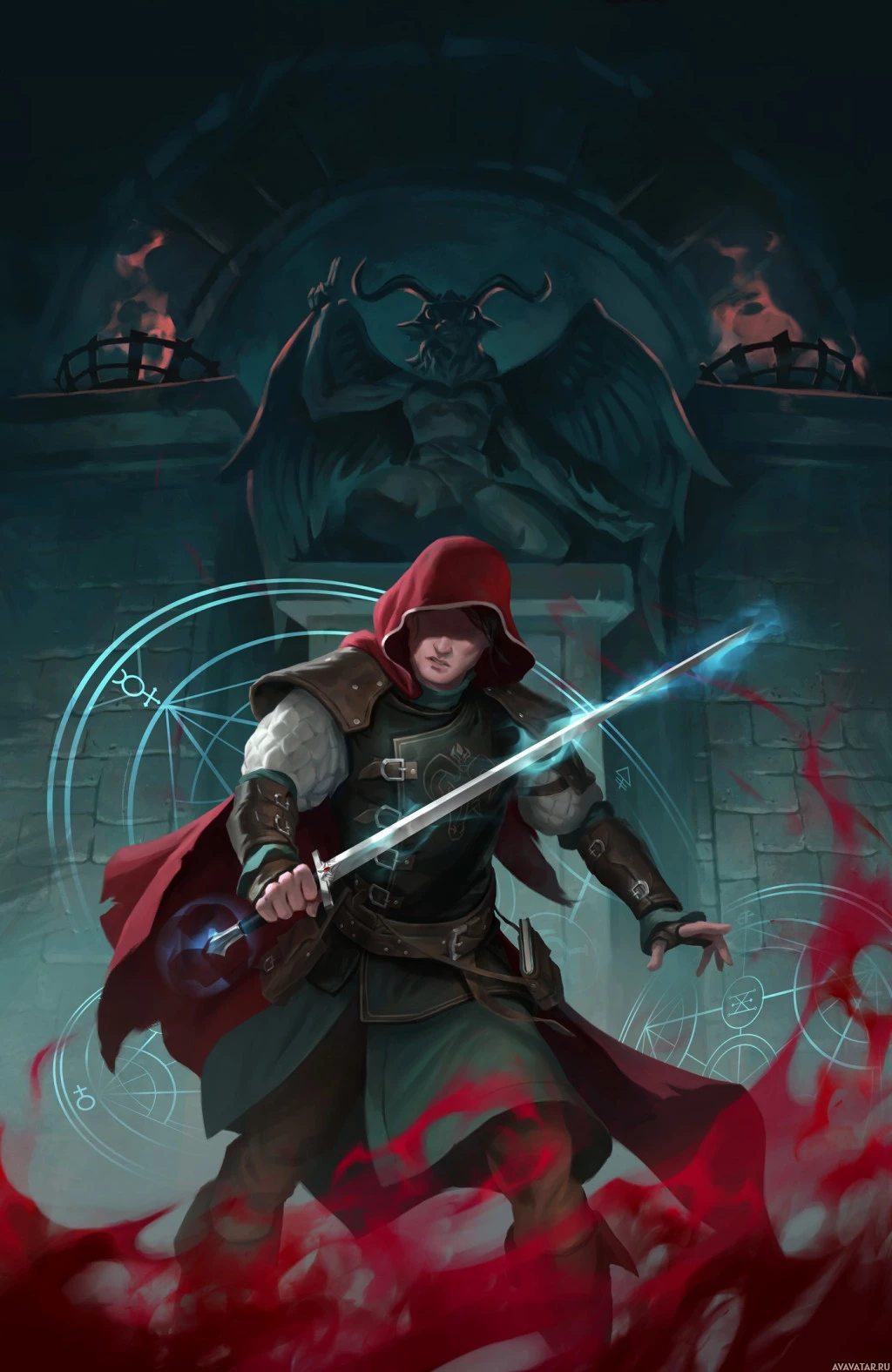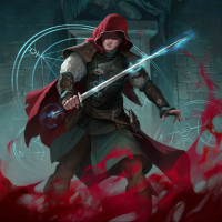 splatters of blood around him, suggesting he may have recently fought or killed an enemy. There are also magical symbols and runes visible in the background, indicating that this character might possess