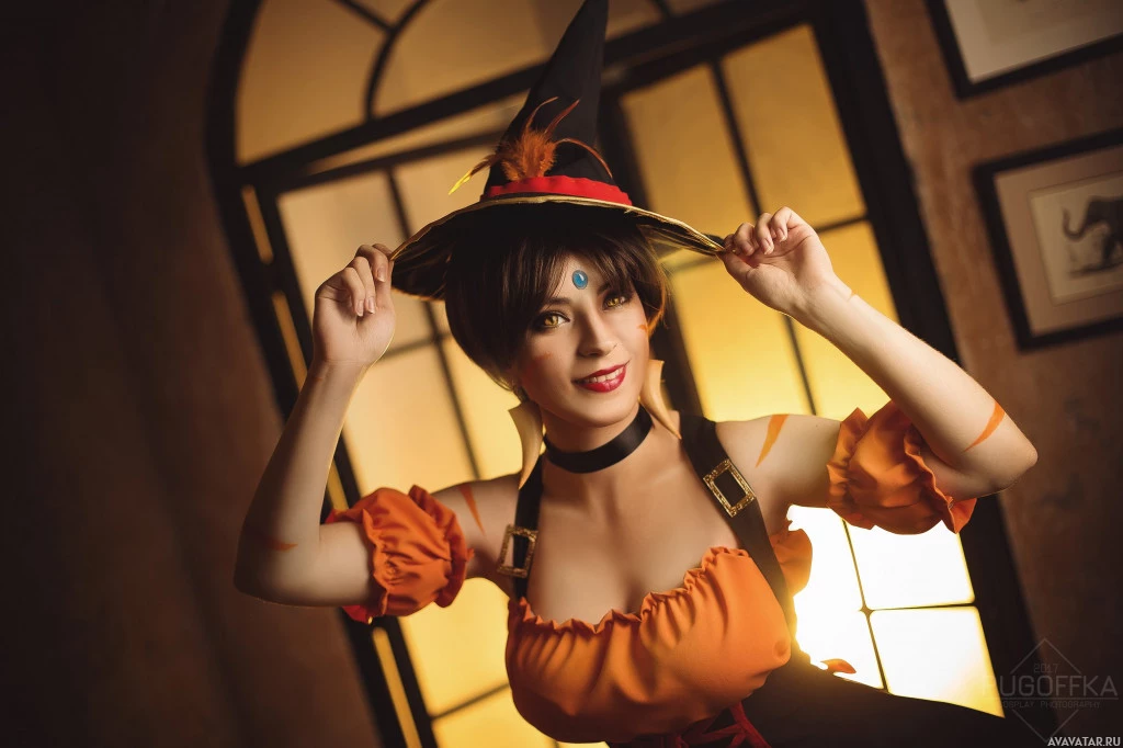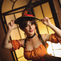 popular culture. The individual has their hands raised near their face as if they are adjusting or playing with something on their head. They are wearing a costume that resembles a typical witch's attire, complete with a ruffled collar and cuffs, and the overall impression is one of playfulness or celebration, possibly related to Halloween or another
