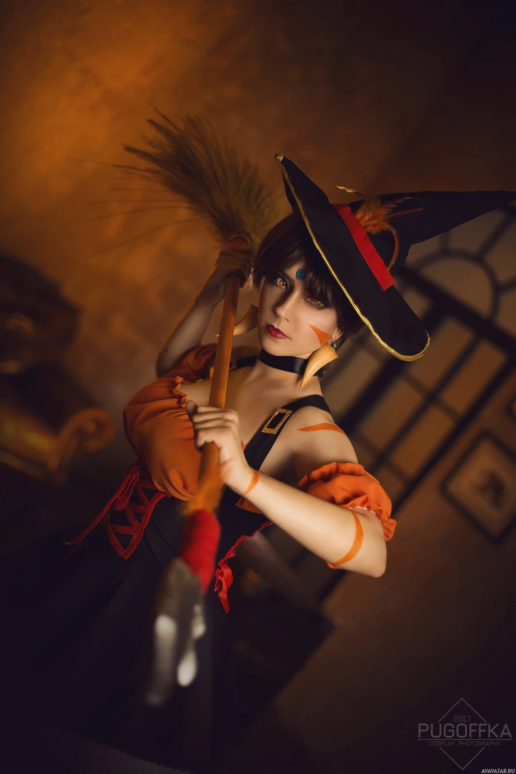 a black dress with red and orange accents that resemble traditional witch attire. The costume includes