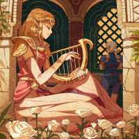 elven attire and holding what looks like a lute or harp, suggesting that she may be performing a song or preparing to play. The style of the image is reminiscent of the artwork from the games themselves, with
