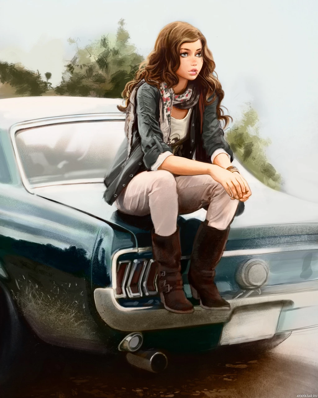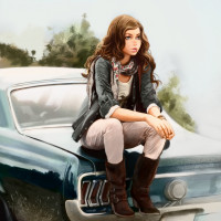 a young woman sitting on the hood of an antique Mustang car. She is wearing
