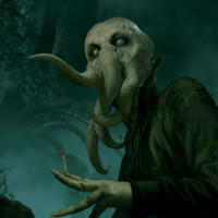 На картинке изображено фэнтезийное существо, которое кажется монстром, похожим на Ктулху. Имеет гуманоидную форму с вытянутыми конечностями и осьминоподобную голову с щупальцами. Существо находится в темной, зловещей среде, что, возможно, указывает на то, что это сцена из фэнтези или ужаса.