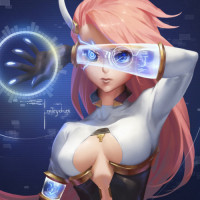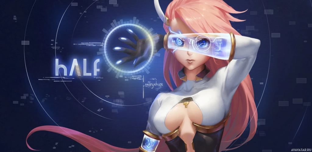 pink hair, blue eyes, and is wearing futuristic attire that includes cybernetic components and circuit-like designs. The setting suggests a high-tech environment, possibly indicating
