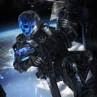 space suit with a helmet and visor, which appears to be part of the suit's life support system. In one hand, the astronaut holds a weapon that looks like a rifle. The background shows a depiction of