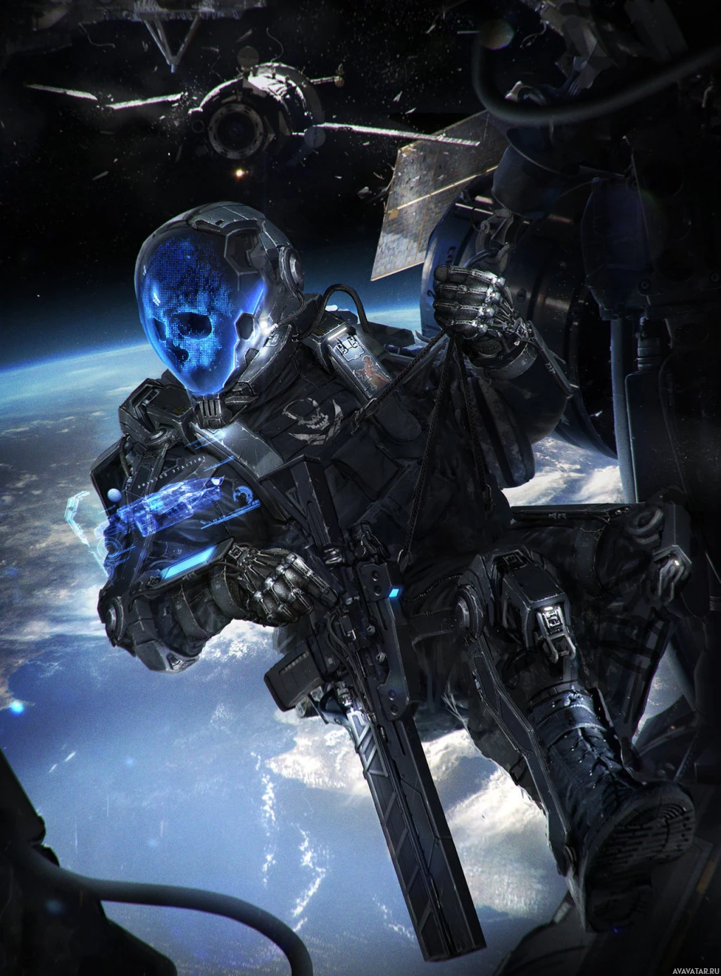 outer space with a view of Earth from orbit, as well as other spacecraft or satellites in the distance. The image conveys a sense of action and adventure within a futuristic science