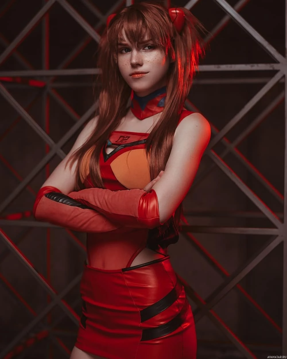 red armor with gold accents and a helmet with horn-like protrusions on the head. They are striking a pose with one hand on their hip and the other arm resting against their thigh. The background has an industrial feel with metal structures that give off
