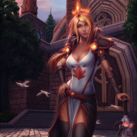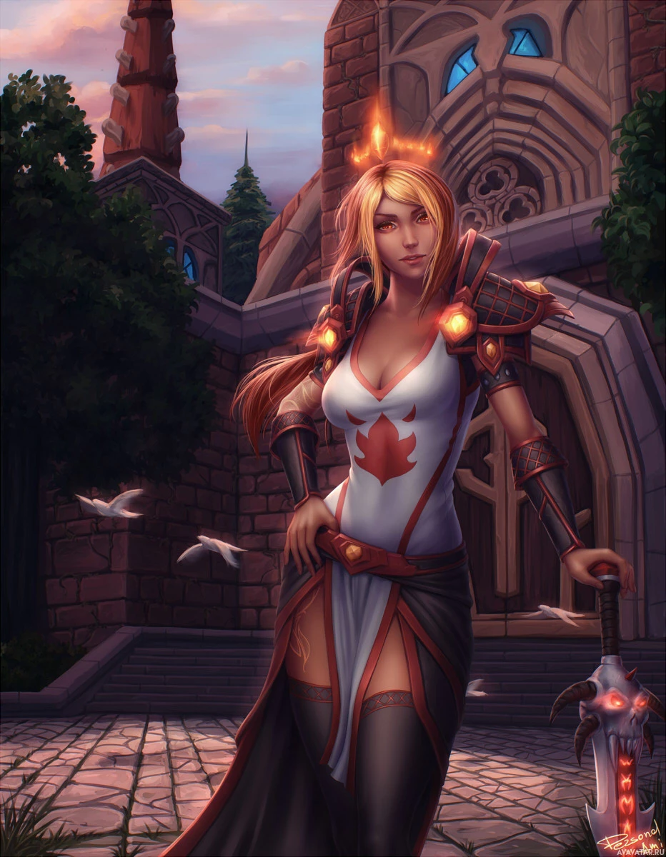World of Warcraft" (WoW), which is an MMORPG (Massively Multiplayer Online Role-Playing Game) developed by Blizzard Entertainment. This character seems to be designed in the style of the game's human female races, possibly a Blood Elf given her wings and armor design. The setting suggests she might be standing near a cathedral or temple-like structure commonly found in